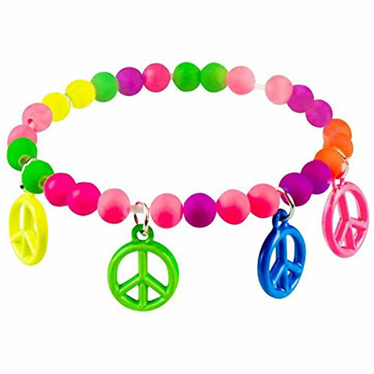 Kleurrijke hippie armband van kralen, voorzien van vier peace teken bedels.