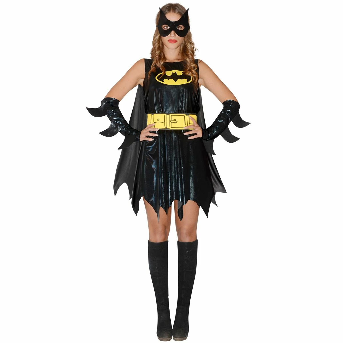Batgirl kostuum bestaande uit: jurkje met cape, riem, armstukken en masker.