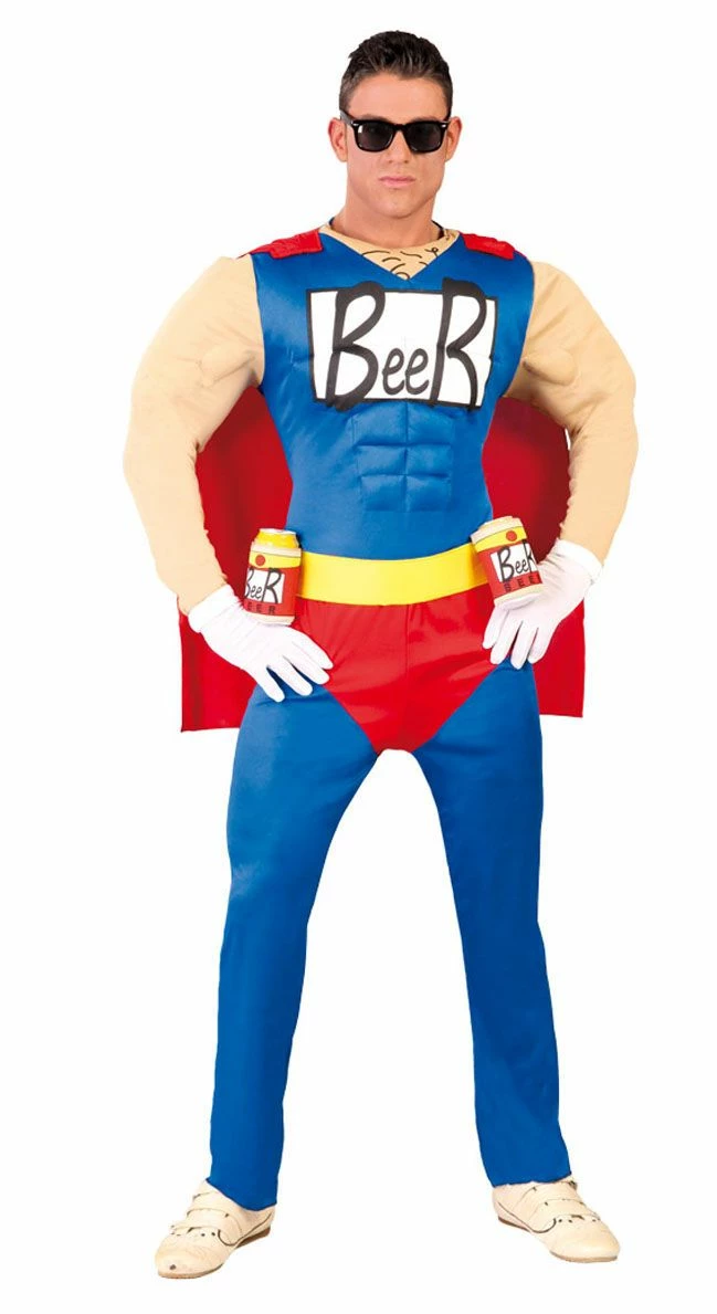 Bier superheld kostuum bestaande uit een jumpsuit, cape, en riem voor bier.