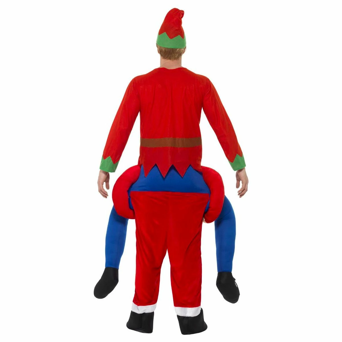 Met dit grappige “man op kerstman” kostuum lijkt het alsof de kerstman je op de nek draagt.