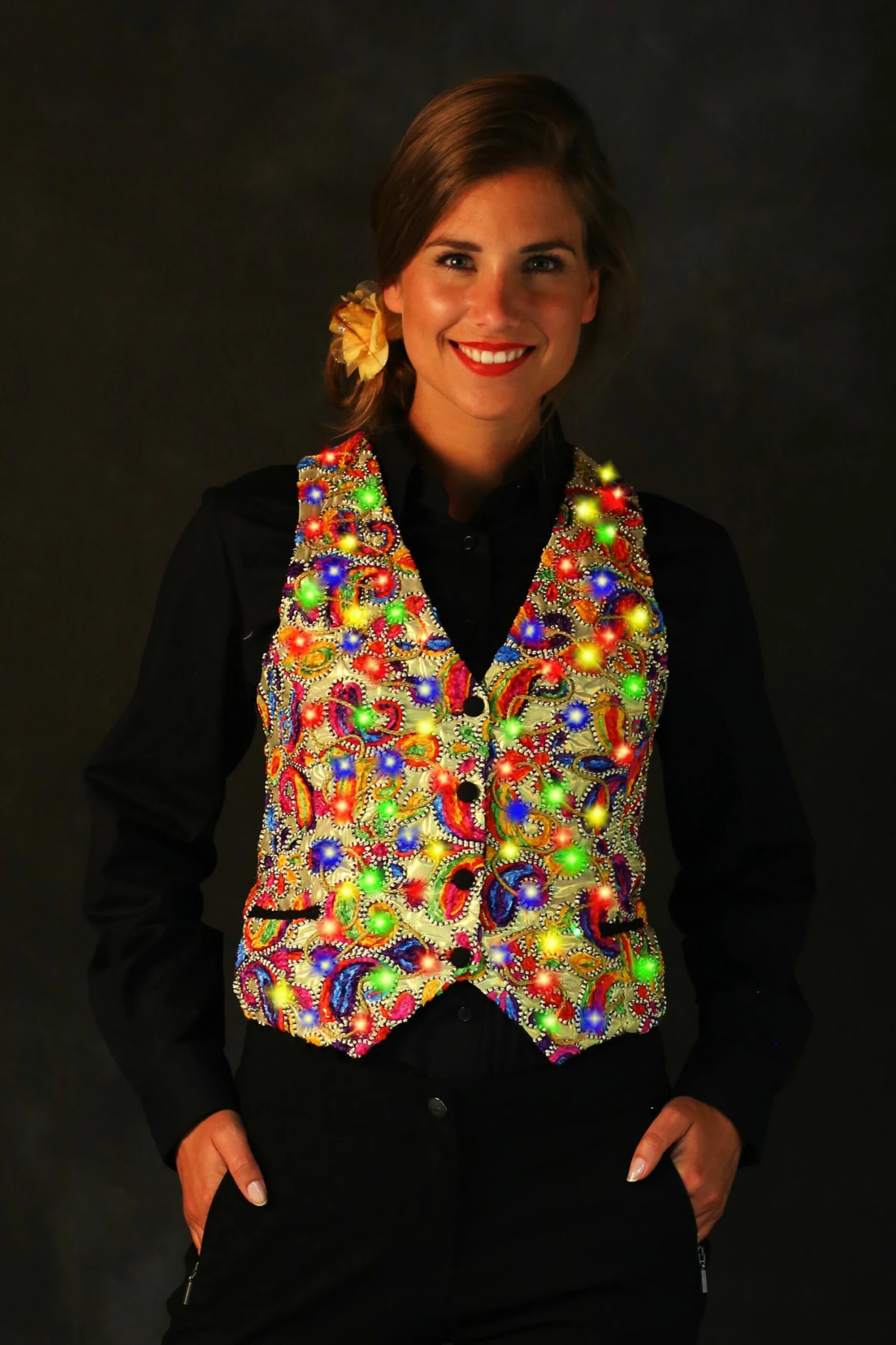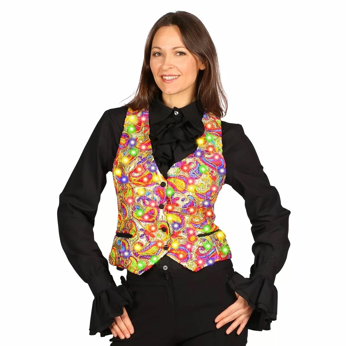 Castalia damesvest in het goud met led-verlichting is een exclusief carnavalsvest. Rijkelijk gekleurd in diverse felle kleuren op een gouden ondergrond. De led-verlichting van de jas is in te stellen op meerdere kleuren. Het Castalia carnavalsvest voor dames is gemaakt van een zeer goede theaterwaardige kwaliteit. Het vest is slechts beperkt geproduceerd en daardoor een echt uniek.