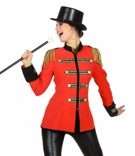 Met deze circus damesjas heb je een perfecte outfit voor de Toppers 2018 concerten. Deze rode damesjas is afgewerkt met zwart en goud. De jas heeft epauletten op de schouders en heeft een ritssluiting aan de voorzijde.