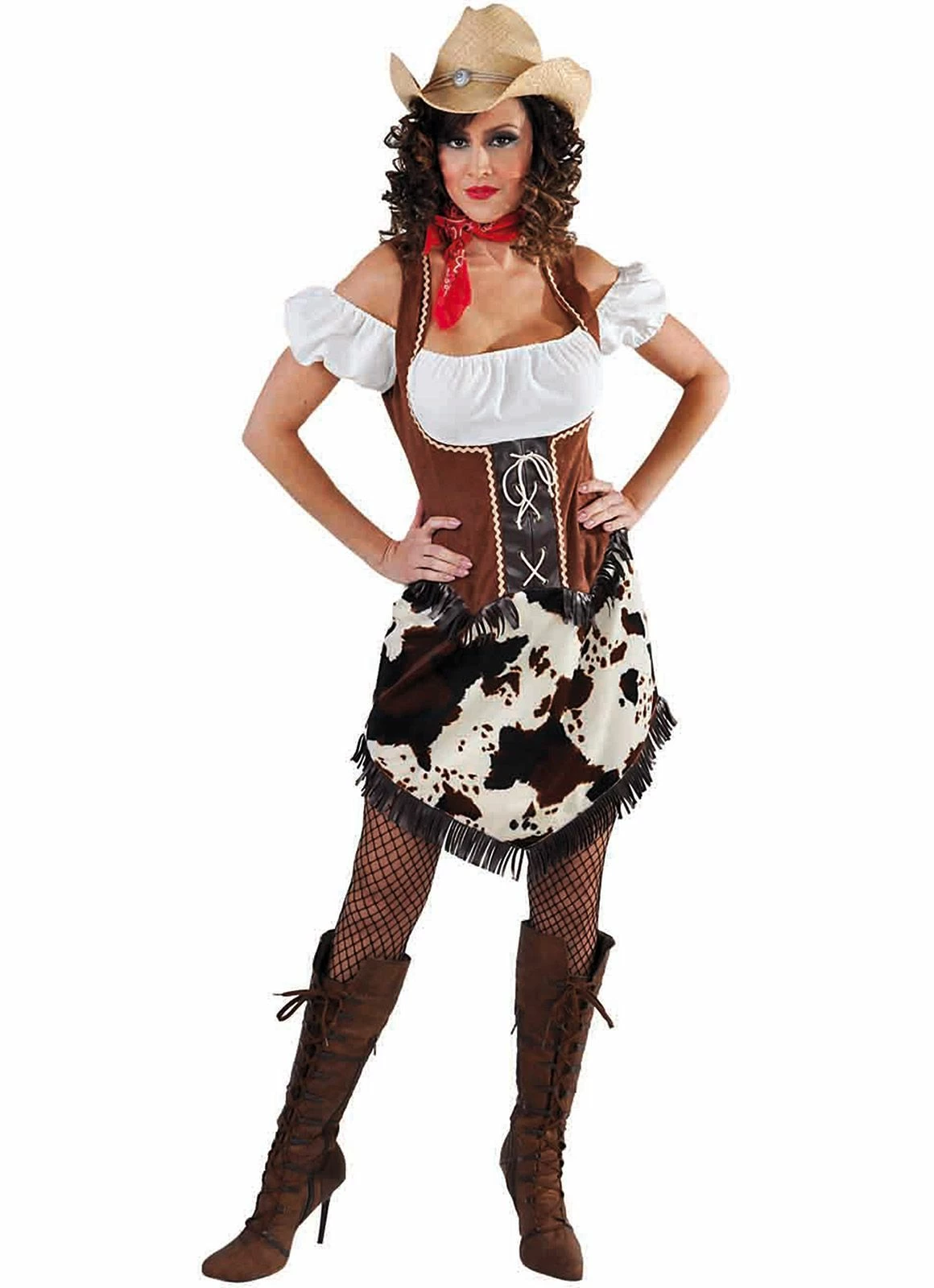Dit Cowgirl kostuum bestaat uit een suedine halterjurkje met daaraan vast een wit blousje met pofmouwtjes en een koe vel rokje.