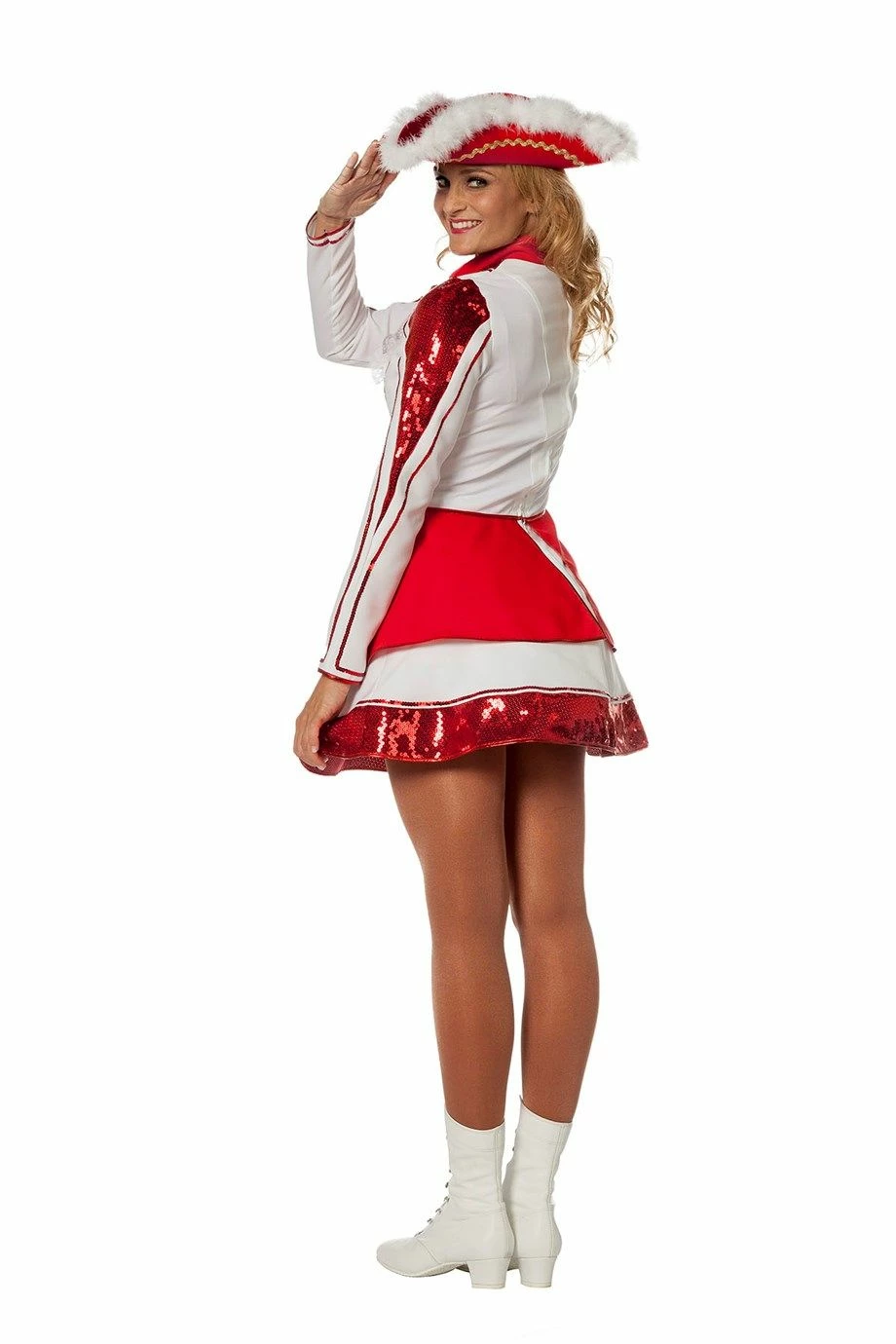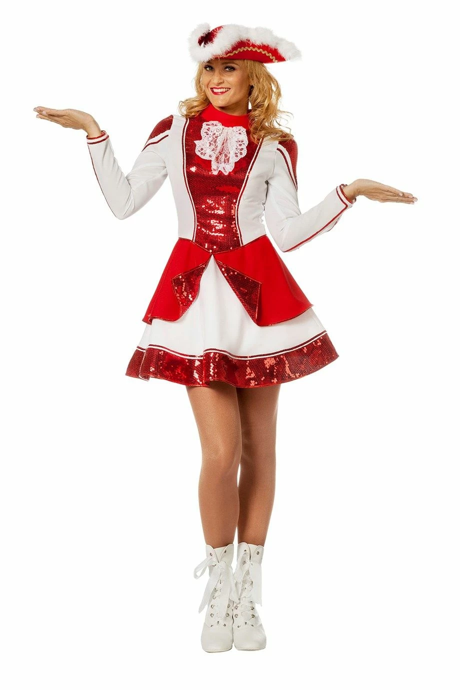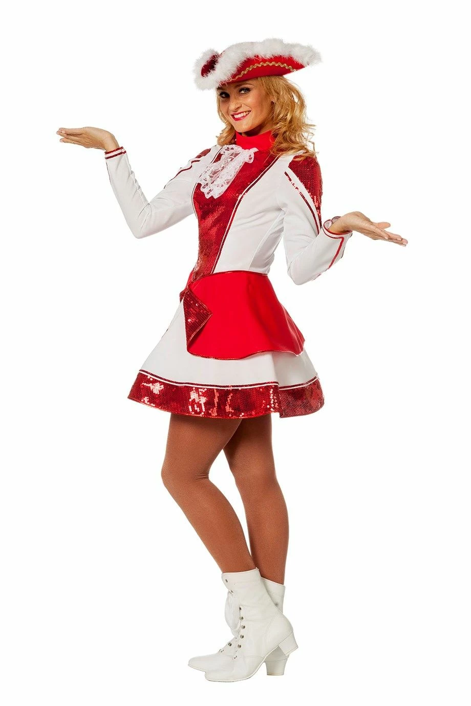Mooie luxe witte dansmarieke jurk met rode pailletten details en witte kanten befje.