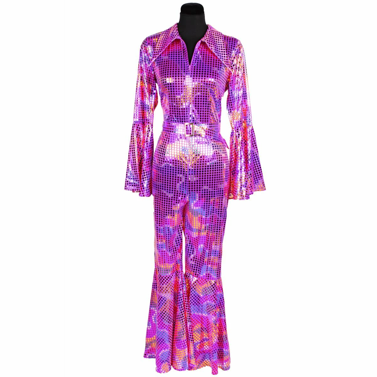 Super sprankelend, paarse disco catsuit. Met deze catsuit met flare mouwen en flare pijpen steel jij de show op het feest. Ook heel leuk voor je Foute Party outfit. Voor heren is een bijpassende blouse verkrijgbaar.