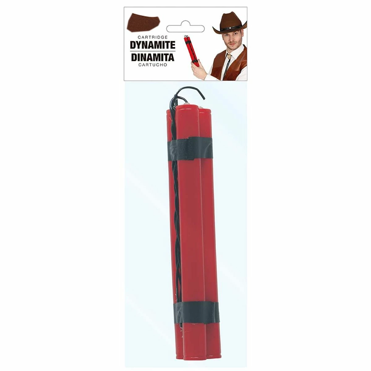 Drie dynamietstaven die aan elkaar zitten gebonden. De staven zijn 25 centimeter lang en daarmee een mooie aanvulling op jouw boevenpak, legerkostuum of cowboyoutfit!