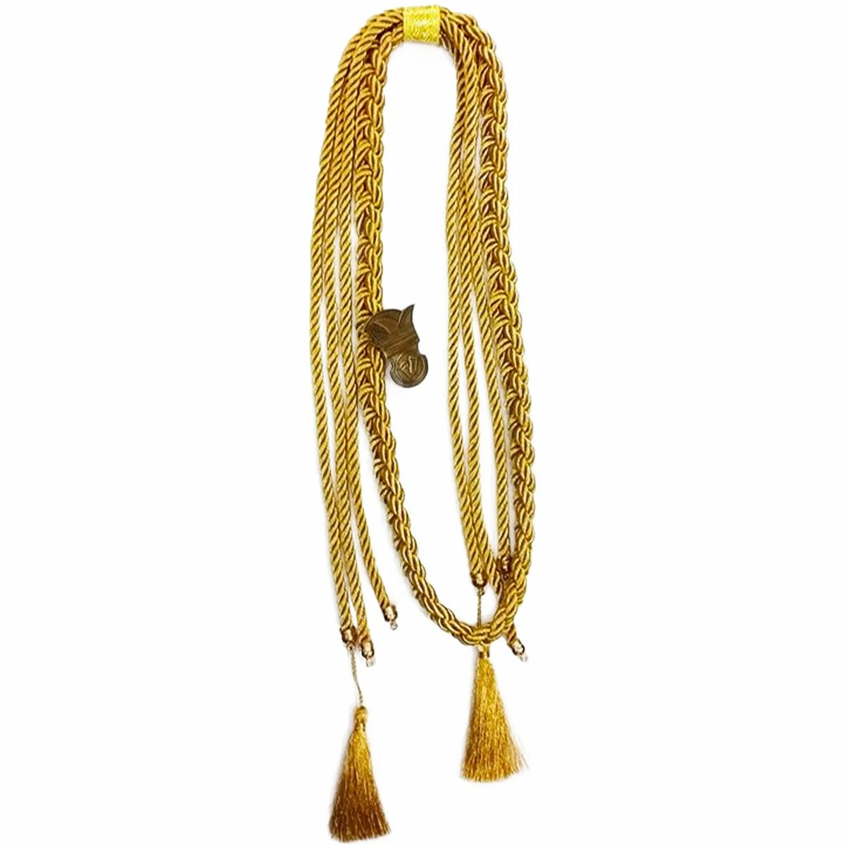 Erekoord set. Deze set heeft een goud gevlochten koord en drie gouden gedraaide koorden. Onderin bij de koorden zijn twee goudkleurige kwastjes bevestigd.