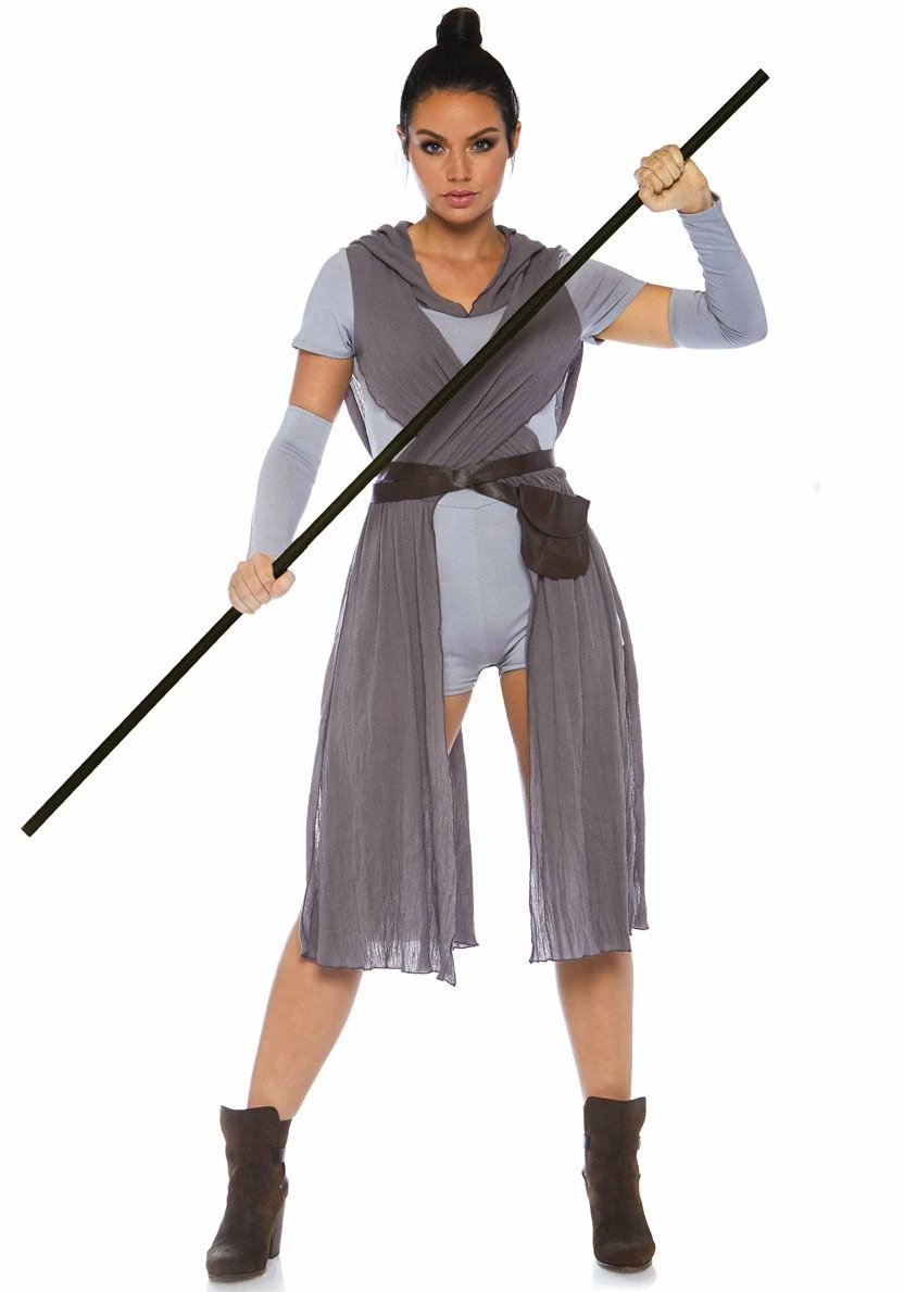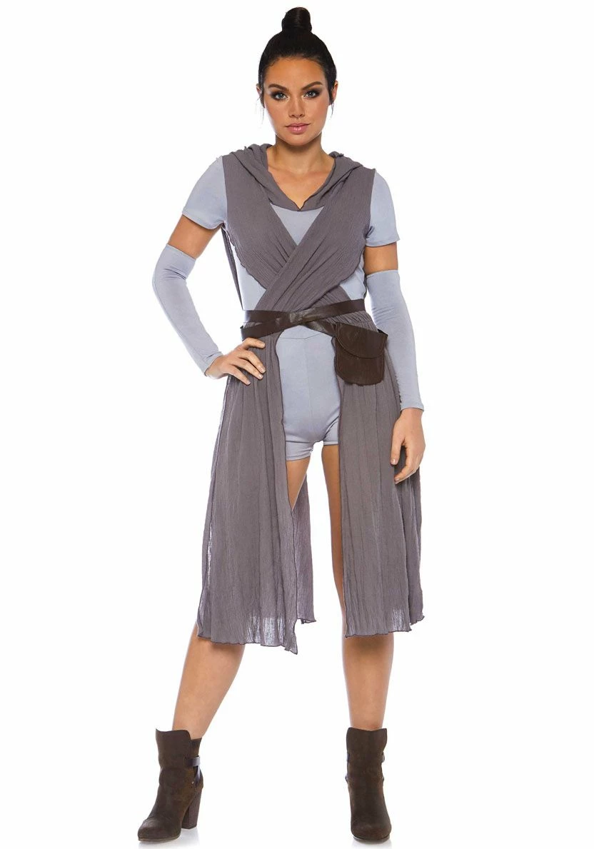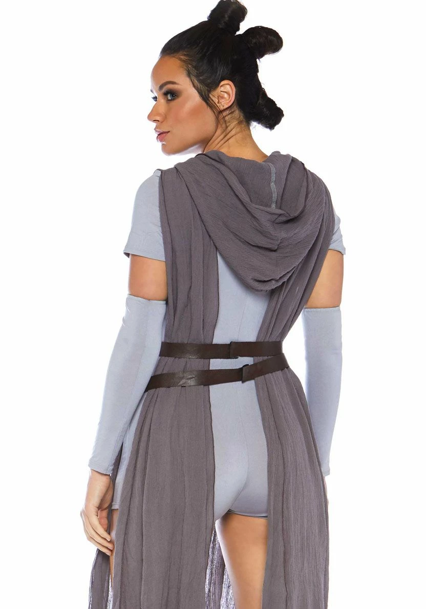 Galaxy Rebel kostuum bestaande uit een romper met overslag sjerp en capuchon, armwarmers en riem met tasje.