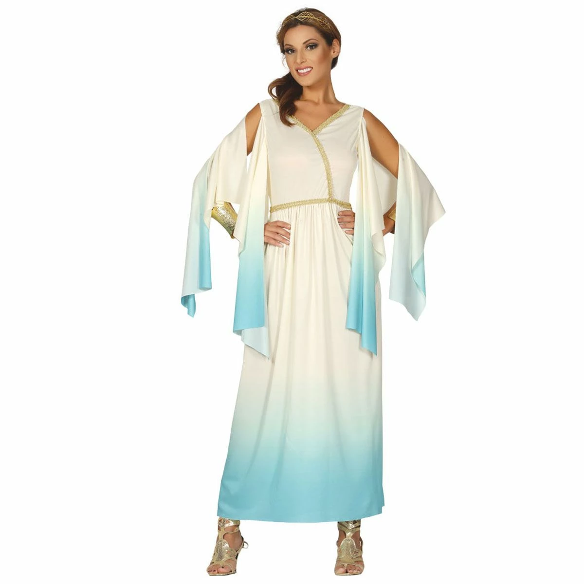 Dit Griekse dames kostuum bestaat uit een lange wit met blauwe jurk met gouden accenten.
