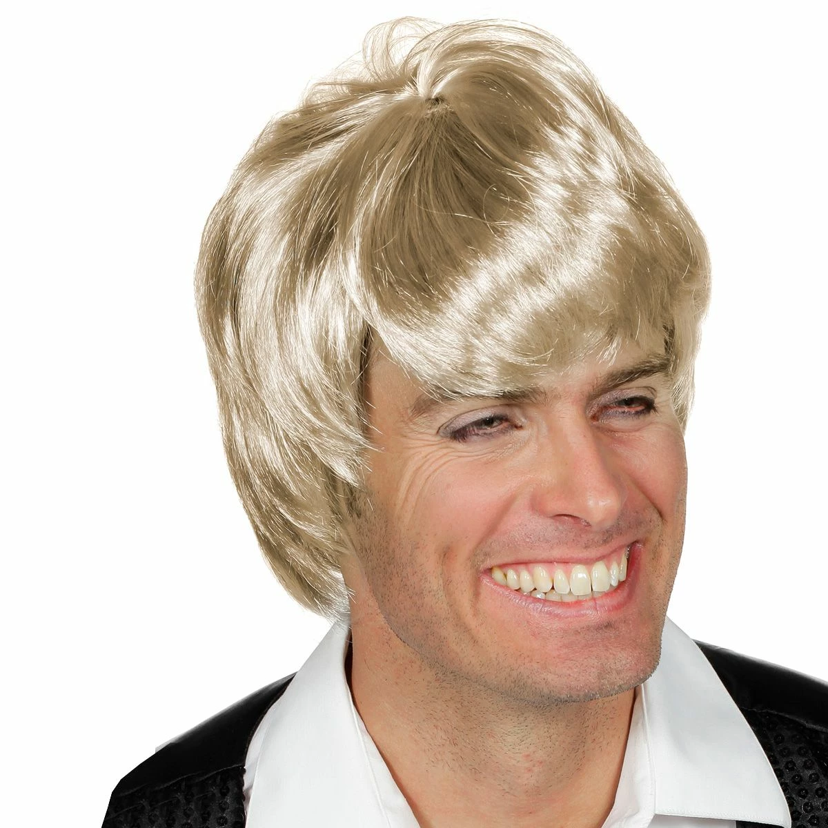 Korte, strakke, blonde herenpruik in seventies stijl.