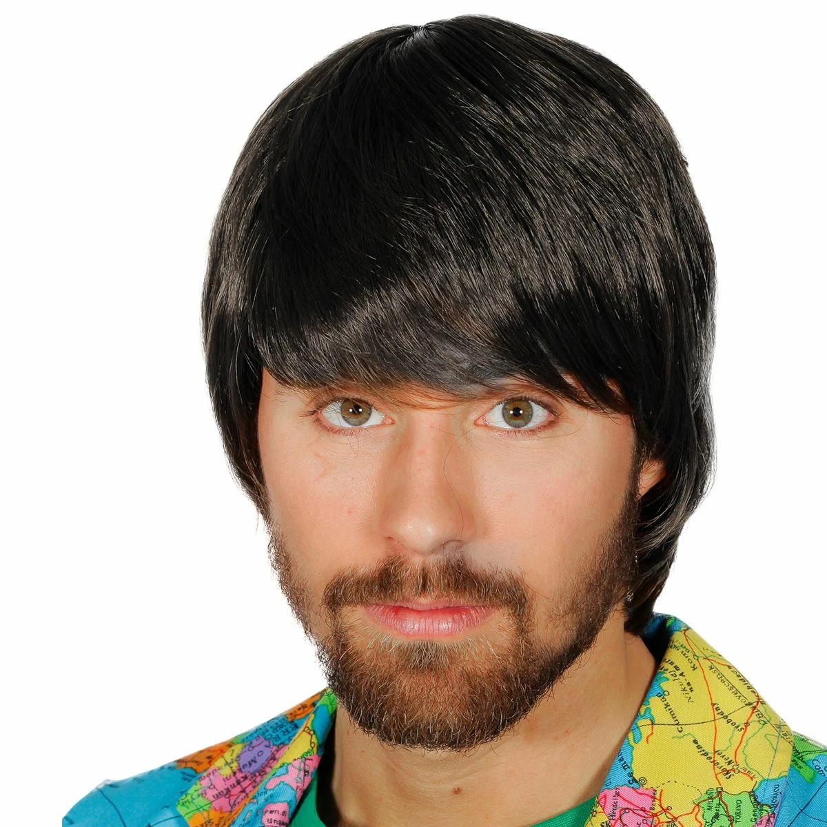 Korte, strakke, zwarte herenpruik in seventies stijl.