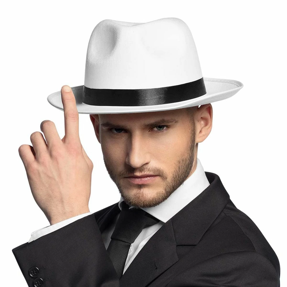 Witte gleufhoed met band, geschikt voor bijvoorbeeld een maffia outfit. Onze size.