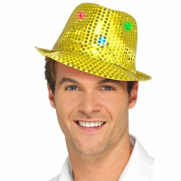 Gouden glitterhoed met led-lichtjes. Leuk voor glitter, popstar thema.