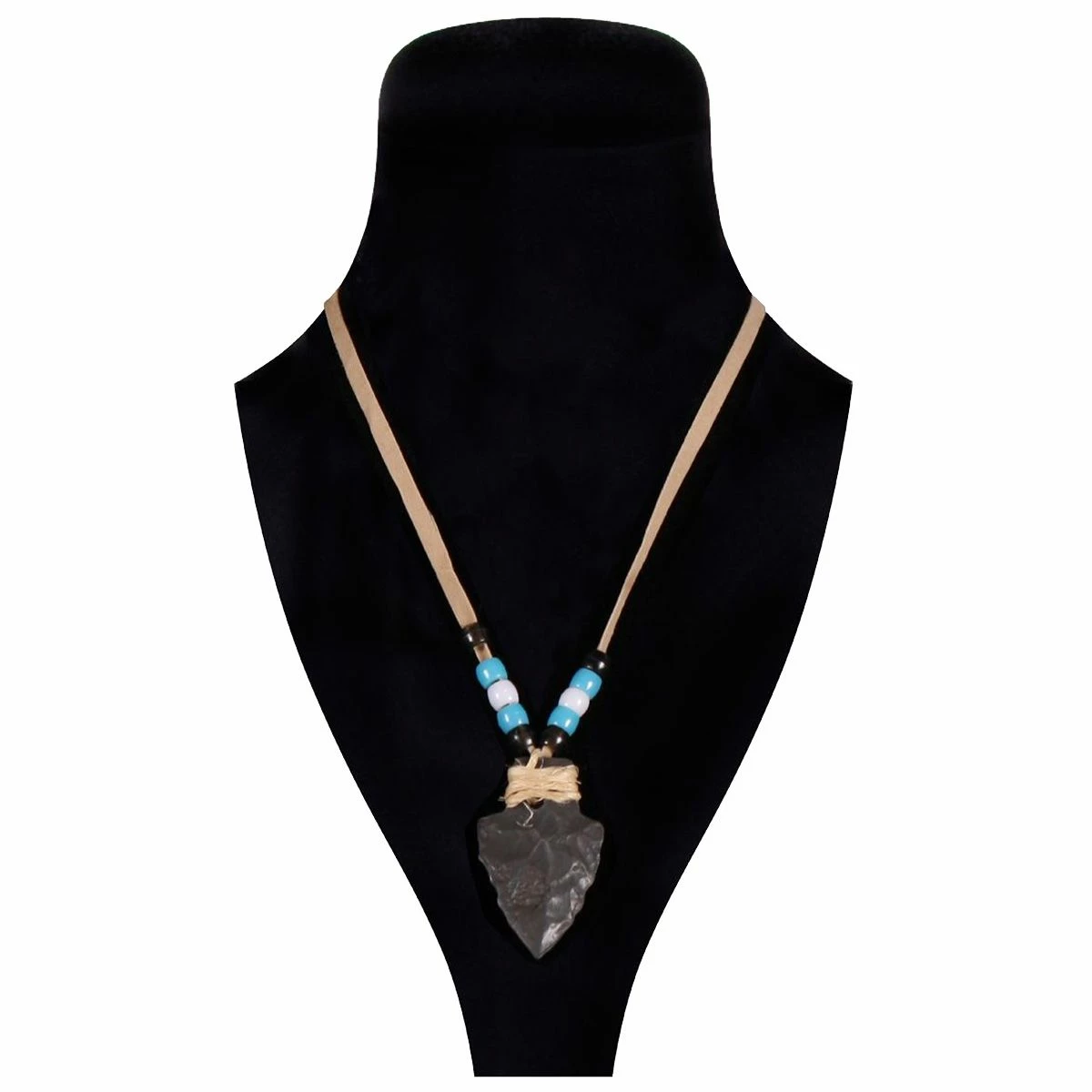 Bruin suede ketting met pijlpunt hanger. De indianenketting is verder versierd met blauwe en witte kraaltjes.