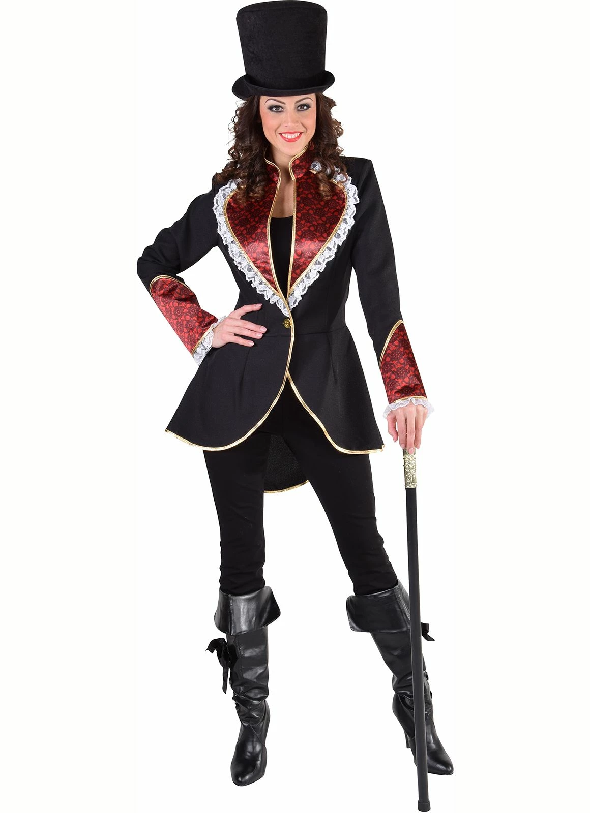 Deze jas Scarlet is zwart van kleur en heeft een zwart met rode rever voorzien van wit kant.