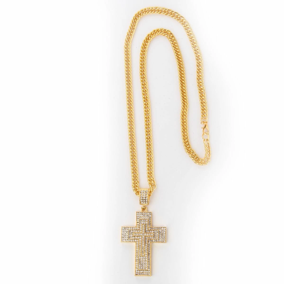 Mooie robuurste gouden ketting met groot kruis eraan. Het kruis is bezet met kunst diamantjes. Perfect voor je gangster/maffia/foute party outfit.