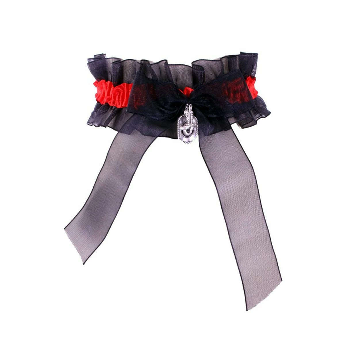 Ketting in het rood met zwart kant en een cowboyhoed bedel. De ketting draag je straks om je hals als een choker ketting.