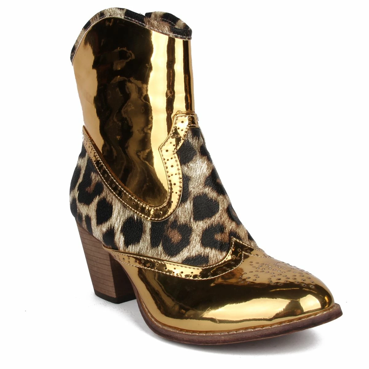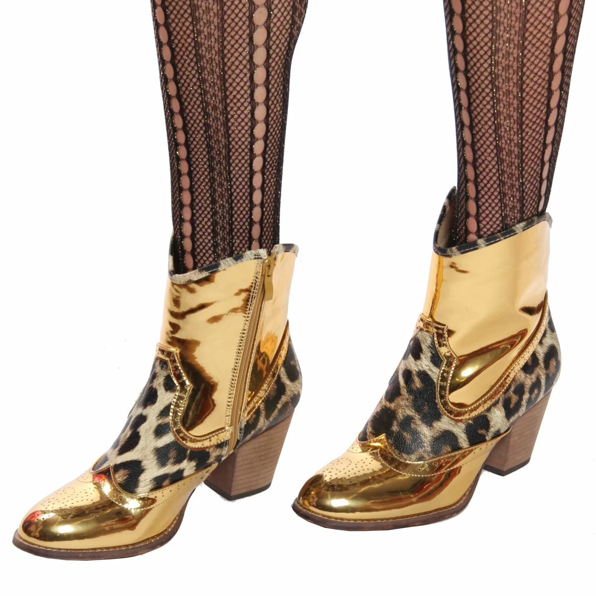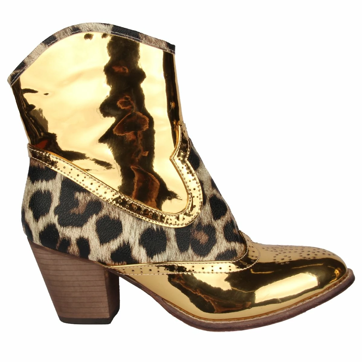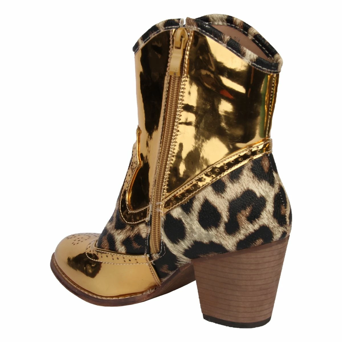Deze korte laarsjes met hakje en rits, uitgevoerd in panterprint met lak goud zijn helemaal te gek om te combineren bij jouw outfit! Verkrijgbaar in maat 36 t/m 41. Combineer deze laarsjes met een leuke panty of gouden legging voor een maximaal effect.