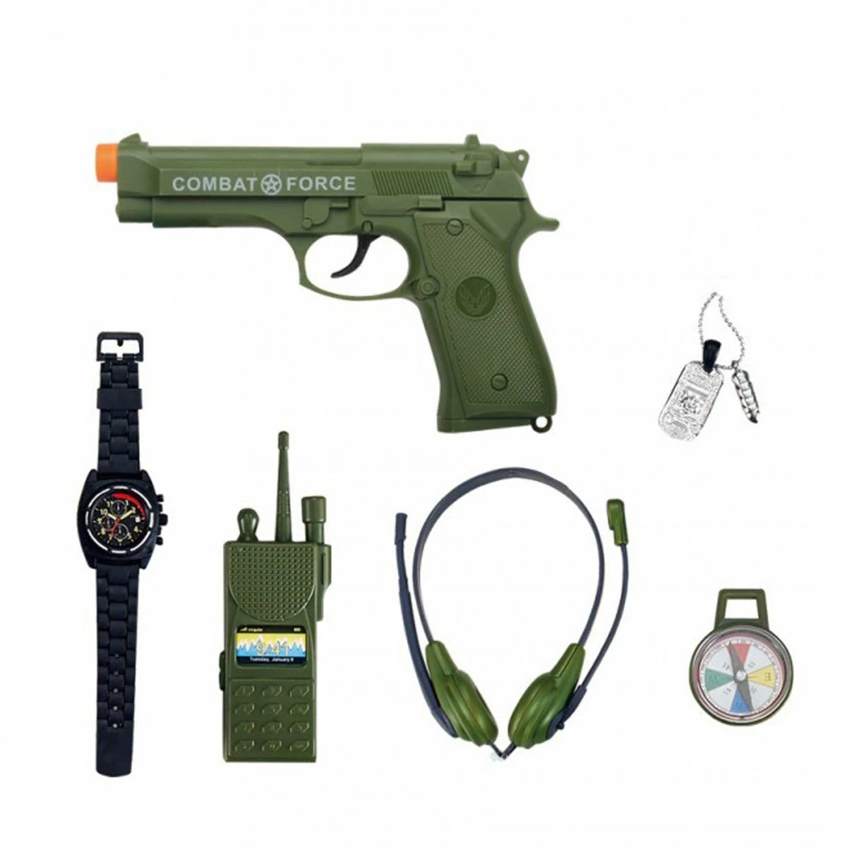 Dit leger Combat Force setje bestaat uit een geweer, ketting, kompas, headset, walkie talkie en een horloge.