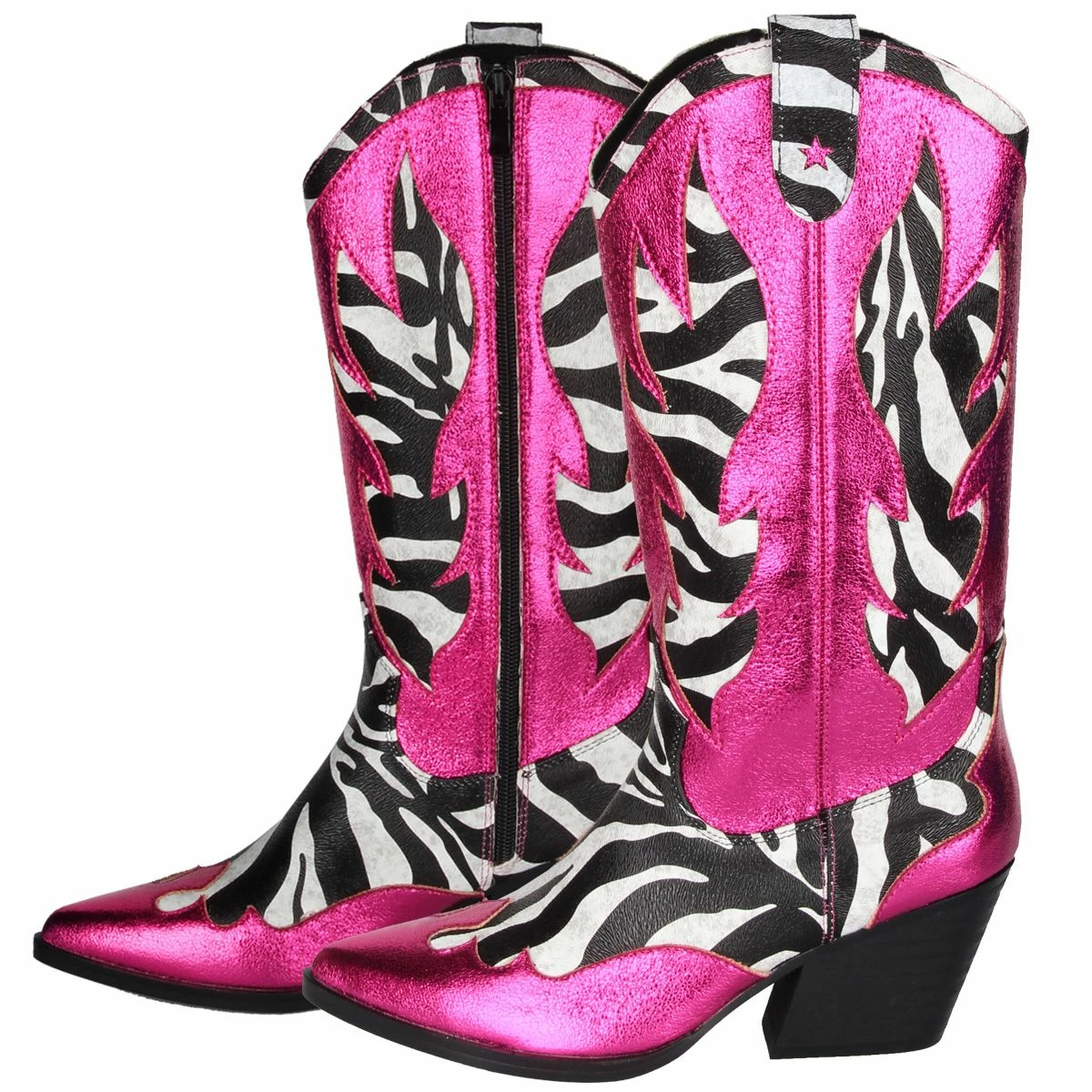 Schitterende, luxe western laarzen in een combinatie van kwalitatief hoogwaardige, metallic roze en zebraprint, kunstleder. Deze super sprankelende laarzen schitteren je tegemoet! De laarzen hebben vlammende western vormen aan de zijkant. Aan de binnenzijde zit een rits over de volle lengte, daarmee zijn deze laarzen geschikt voor zowel volle als slanke kuiten. De binnenzijde is van een zachte alcantara (voelt als suède). Het soepele materiaal zorgt ervoor dat de laarzen heerlijk dragen en een zeer fijne pasvorm hebben. Deze laarzen zijn een echte eye-catcher tijdens carnaval, een thema-feest of op een festival.