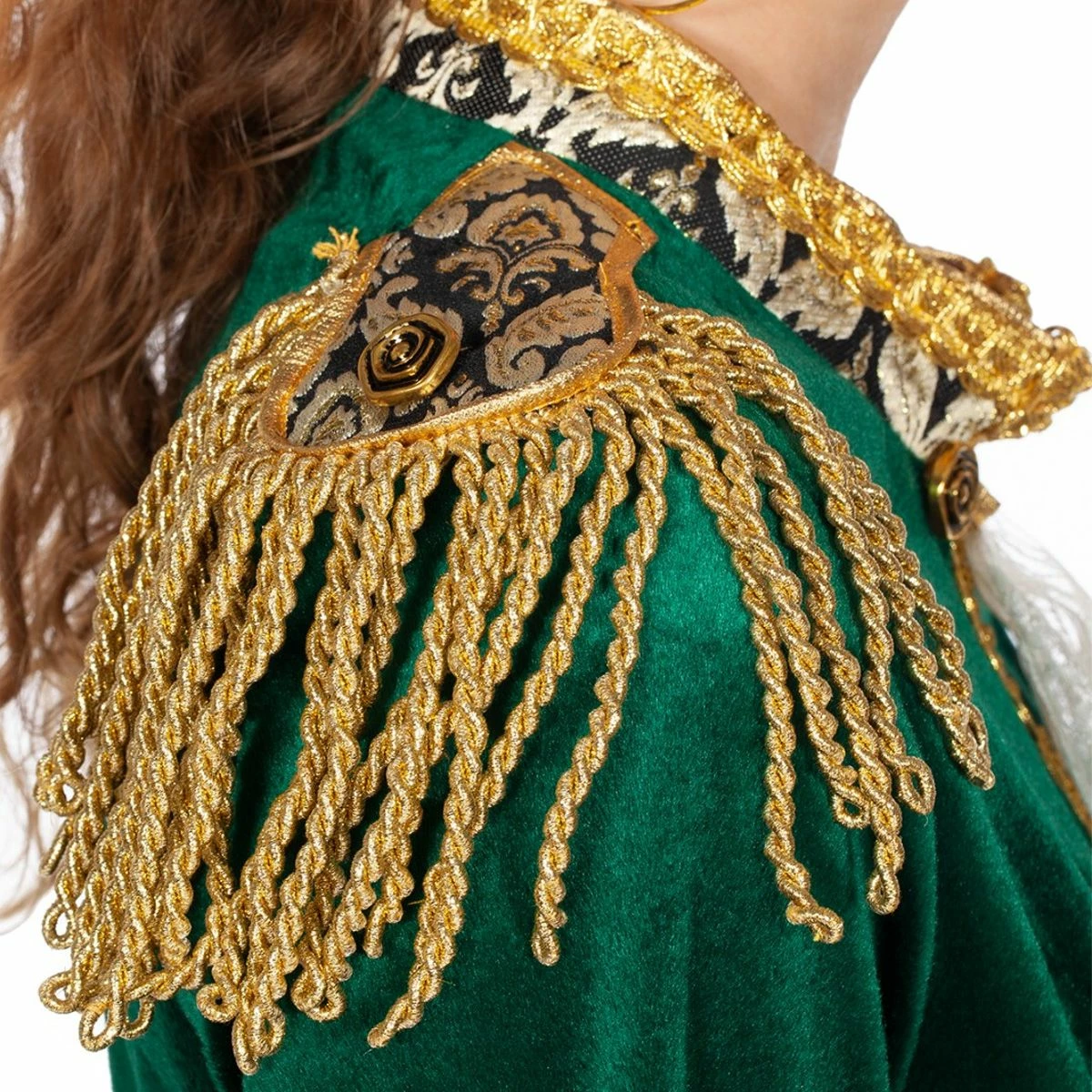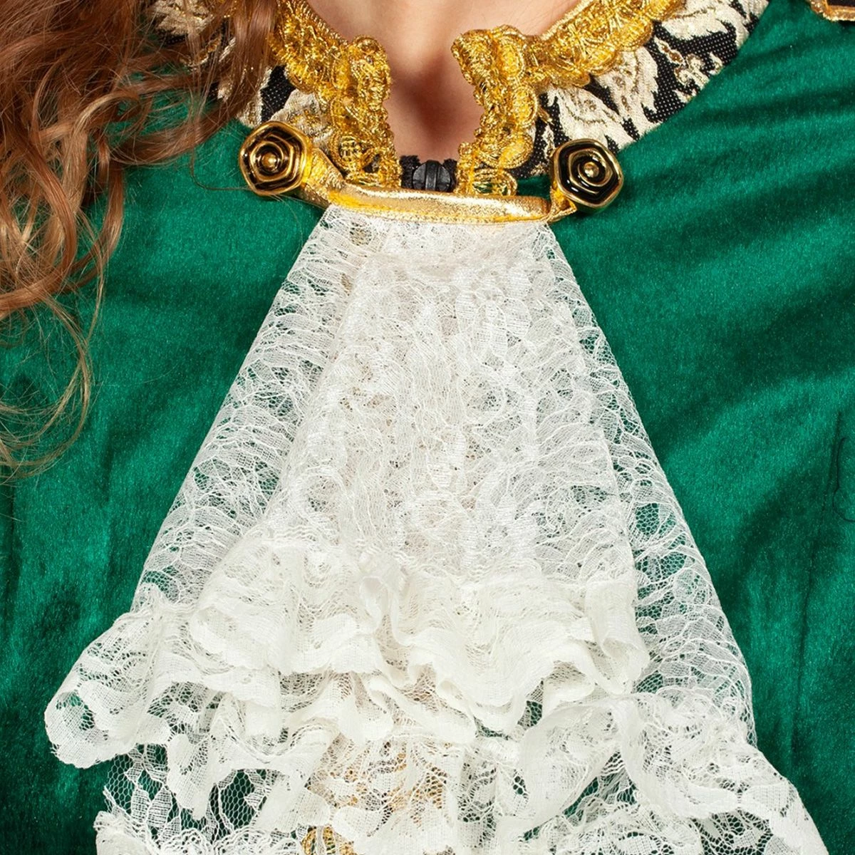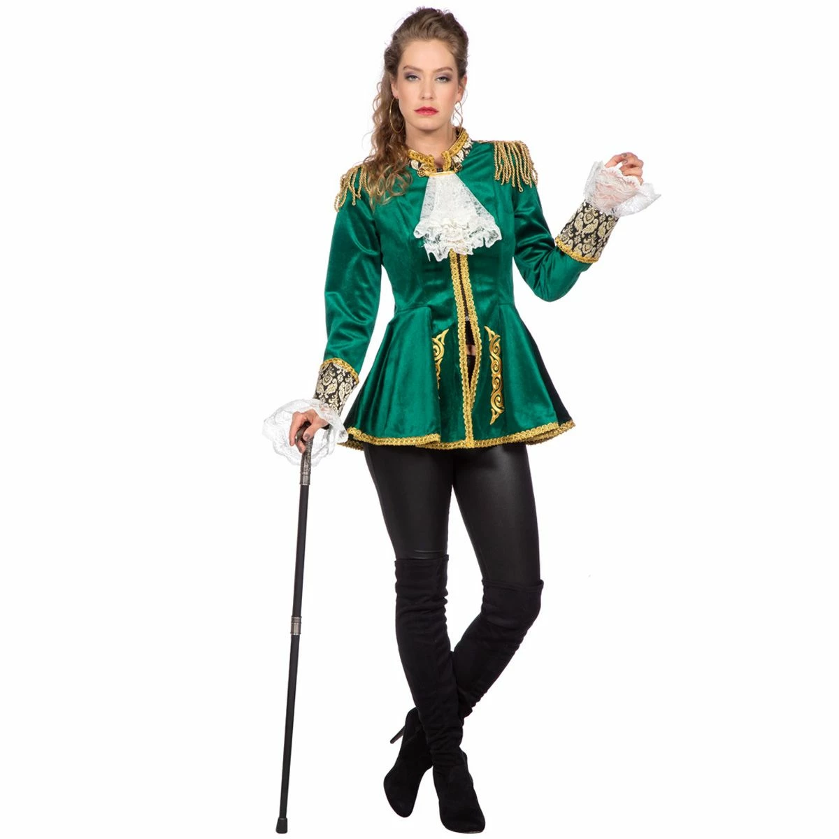 Prachtige, luxe getailleerde groene fluwelen damesjas met een wit kanten jabot en witte kanten mouwen. De jas heeft een mooie pasvorm en is schitterend afgewerkt met gouden brokaat band en borduursels. Inclusief zeer mooie epauletten. Een bijpassende herenversie is ook verkrijgbaar.