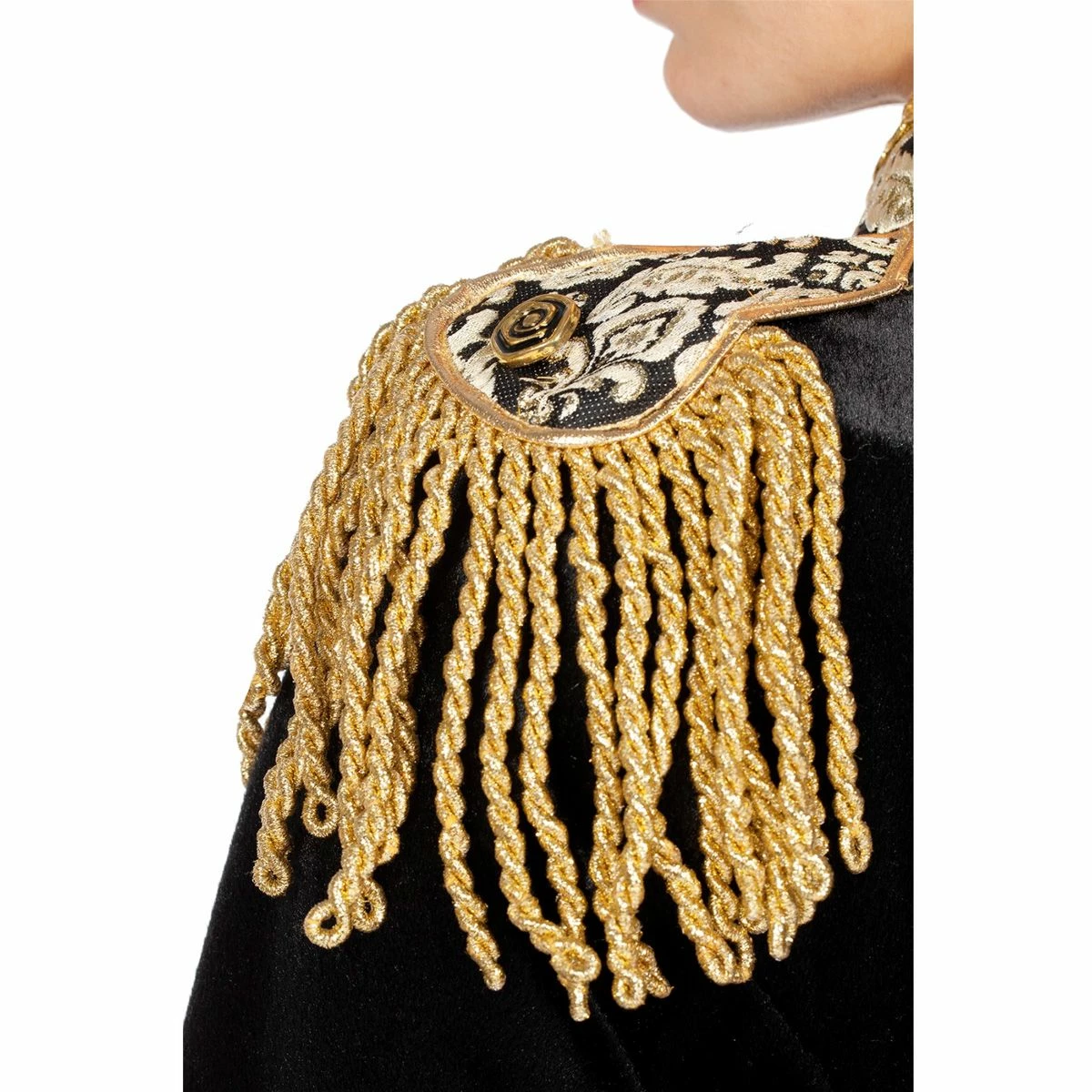 Prachtige, luxe getailleerde zwarte fluwelen damesjas met een wit kanten jabot en witte kanten mouwen. De jas heeft een mooie pasvorm en is schitterend afgewerkt met gouden brokaat band en borduursels. Inclusief zeer mooie epauletten. Een bijpassende herenversie is ook verkrijgbaar.