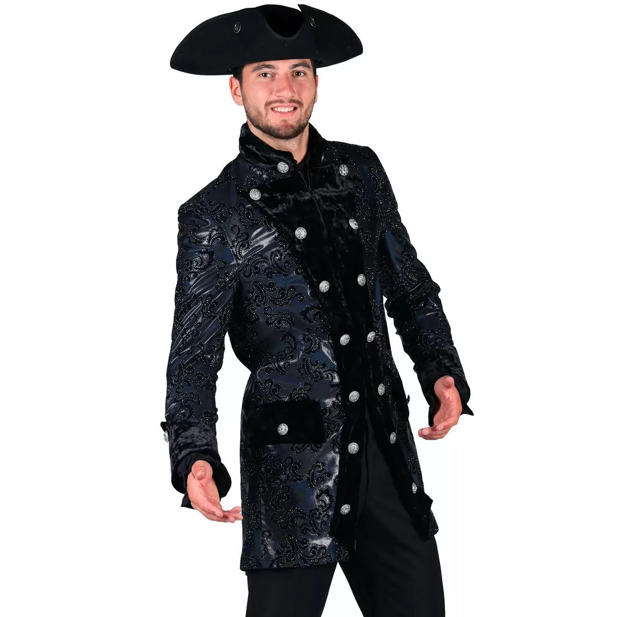 Zeer luxe markies jas. De jas is zwart met een chique zwart patroon, de revers zijn van zwart fluweel. Maak de look af met een van onze driesteken en beenkappen!