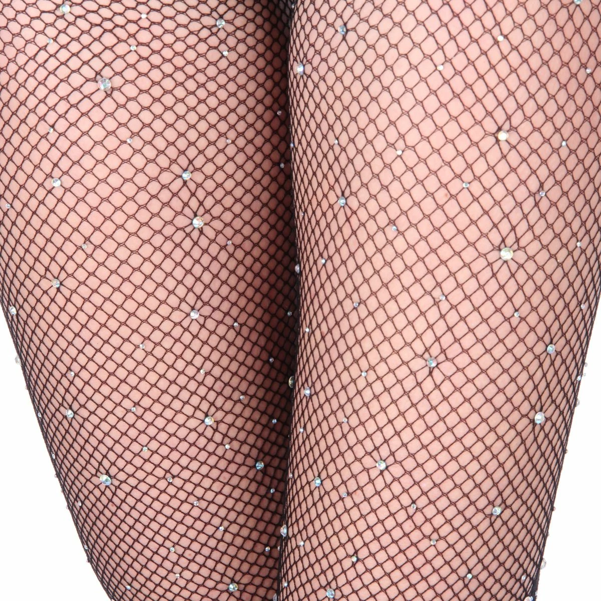 Zwarte netpanty met verschillende maten kunst diamantjes. Hiermee heb je gegarandeerd schitterende benen! De panty is in one size maat, dus geschikt voor XS t/m XXL.