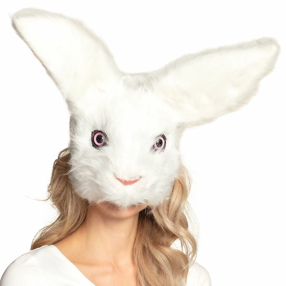 Super leuk konijn / paashaas half masker van pluche. Dit grote witte masker is perfect om je paashaas of konijn outfit af te maken. Combineer ‘m met een van onze paashaas pakken!