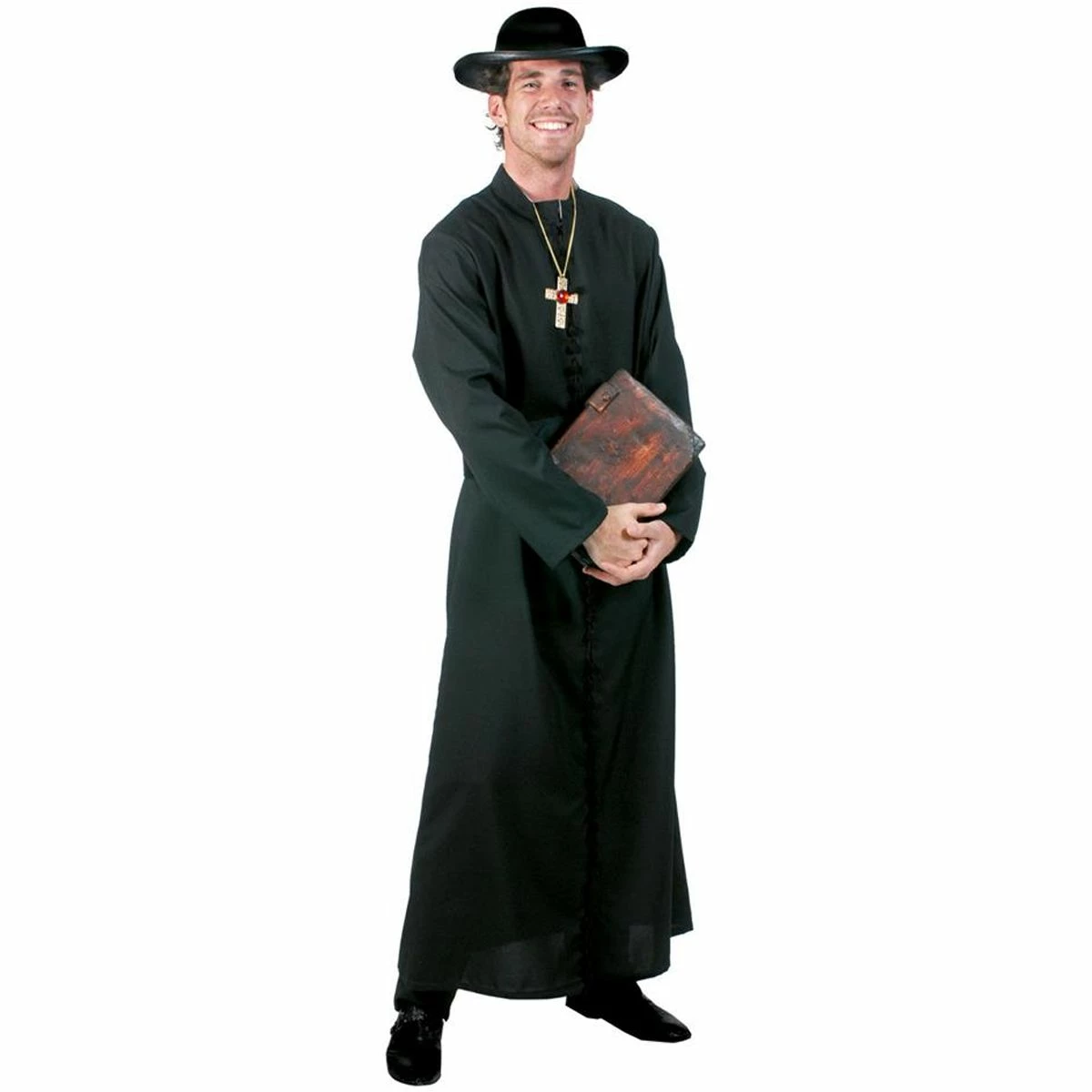 Mooi zwart priester kostuum bestaand uit een gewaad en een riem. Combineer deze outfit met wat schmink om er een geweldige halloween outfit van te maken. Ook leuk als koppel outfit samen met een van onze nonnen kostuums. Met dit pak ziet u er hemels uit!