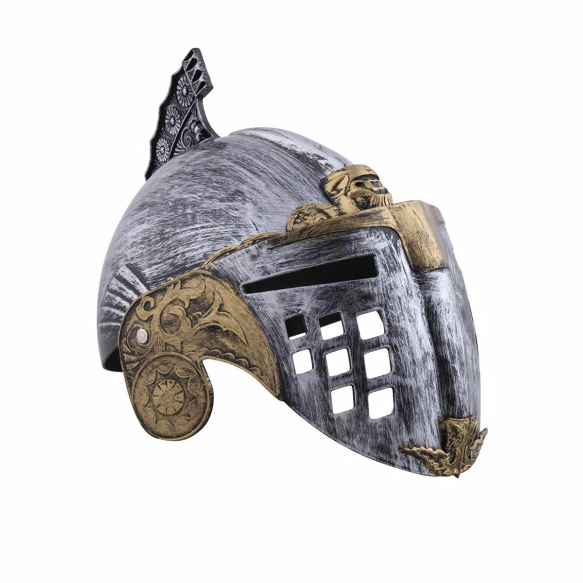 Stoere ridderhelm in zilvergijs/goud met een vizier wat open en dicht kan. Met deze helm is jouw ridderoutfit helemaal compleet!