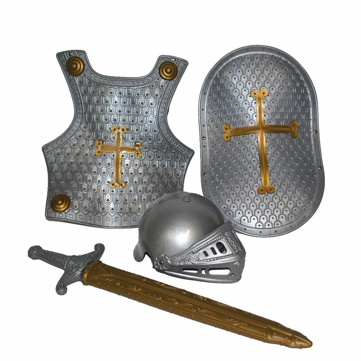 4-delige ridderset. Bestaat uit: harnas, helm, zwaard en schild.