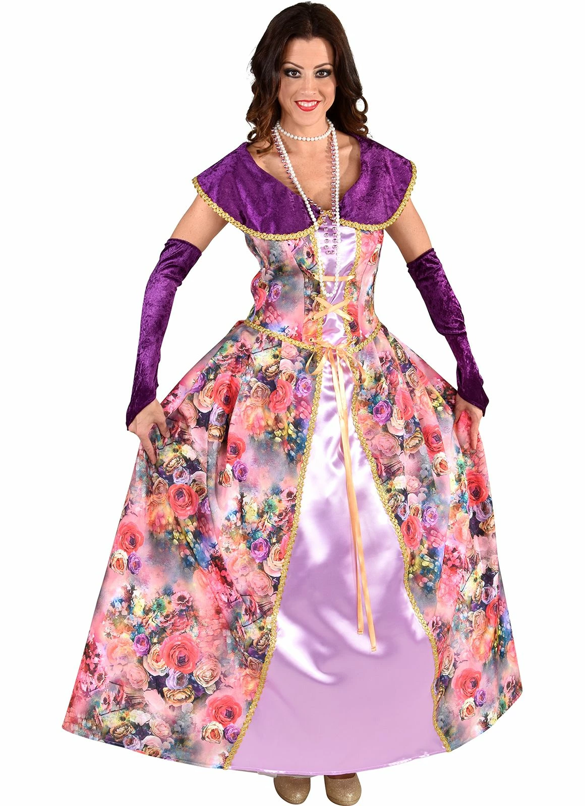 Lange markiezin jurk voor dames met rozen print. De jurk heeft een satijnachtige uitstraling.