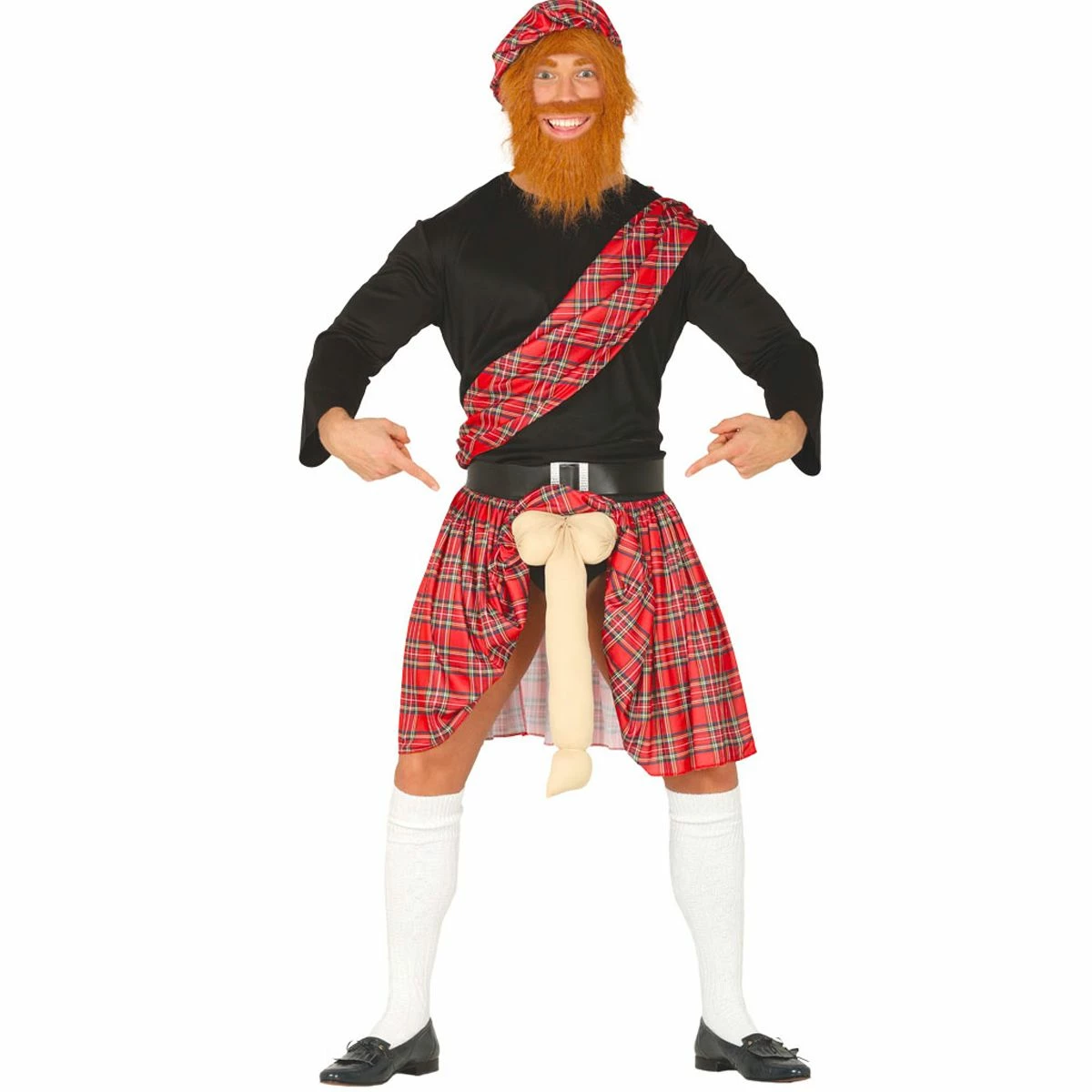 Schotse man kostuum met een “verrassing”. Een grappig kostuum voor carnaval of een vrijgezellenfeest.