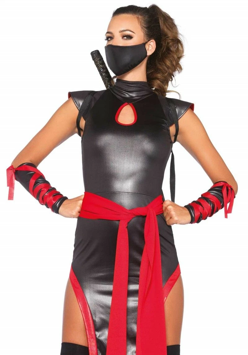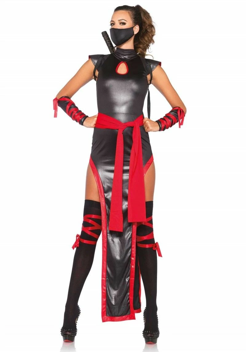 Dit Shadow Ninja kostuum bestaat uit een lange wet look jurk, heup sjaal, masker, arm beschermers en bijpassende kousen, beide omwikkeld met rood lint.