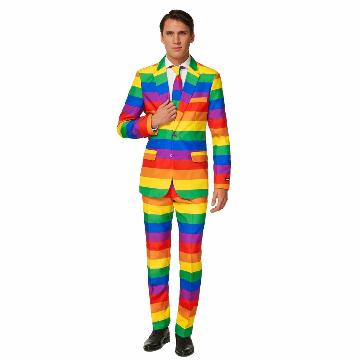 Suitmeister Rainbow is een stoer kostuum voor mannen met regenboogkleuren. Bestaat uit een jas, broek en stropdas.