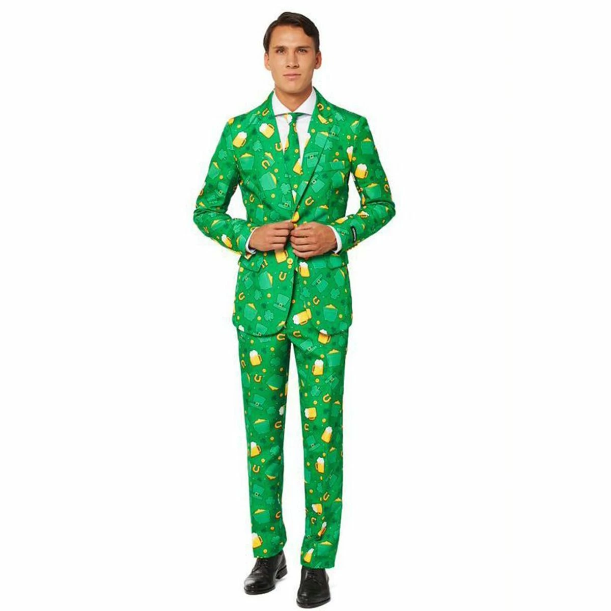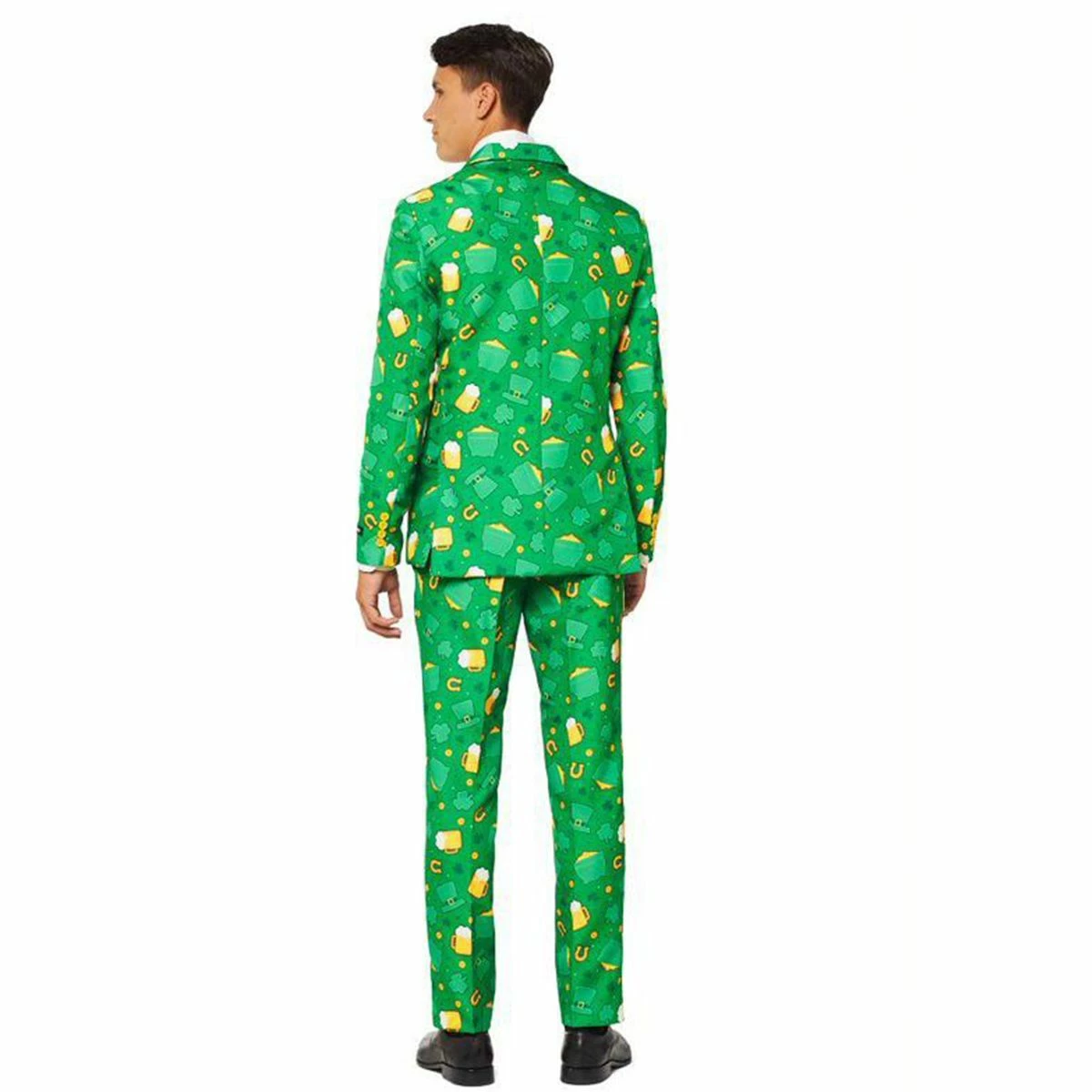 Heren pak Sint Patrick’s day. Groen heren pak met donker en licht groene klavertjes vier inclusief stropdas.