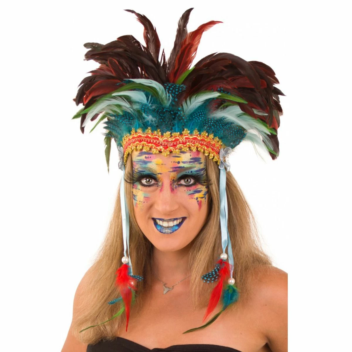 Prachtige luxe goud/rode hoofdband voorzien van een hoofdtooi gemaakt van diverse kleuren (parelhoen) veren.