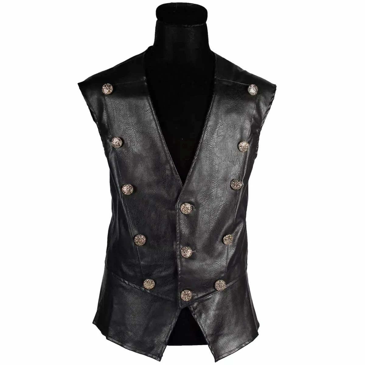 Prachtig vest in zwarte leder look met 3 rijen mooie sierknopen. Dit stoere vest in een schitterend model is zeer geschikt voor een piraten- of middeleeuwse outfit.