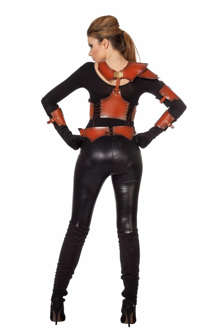 Deze Warrior set bruin/goud bestaat uit een harnas, riem en manchetten