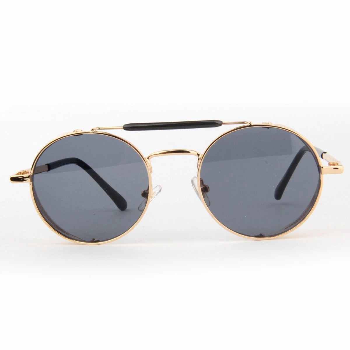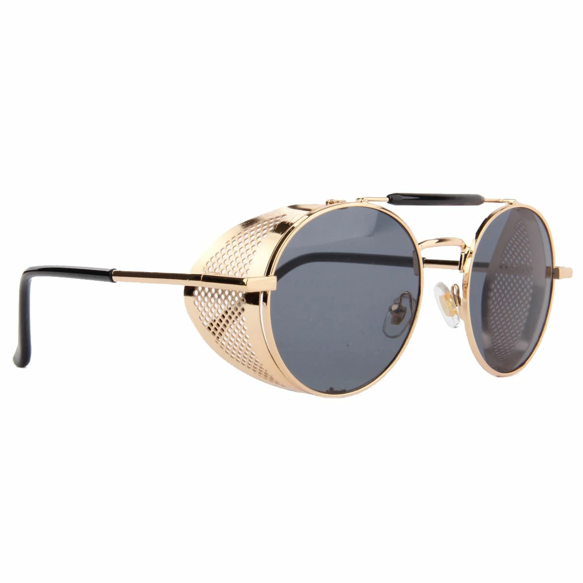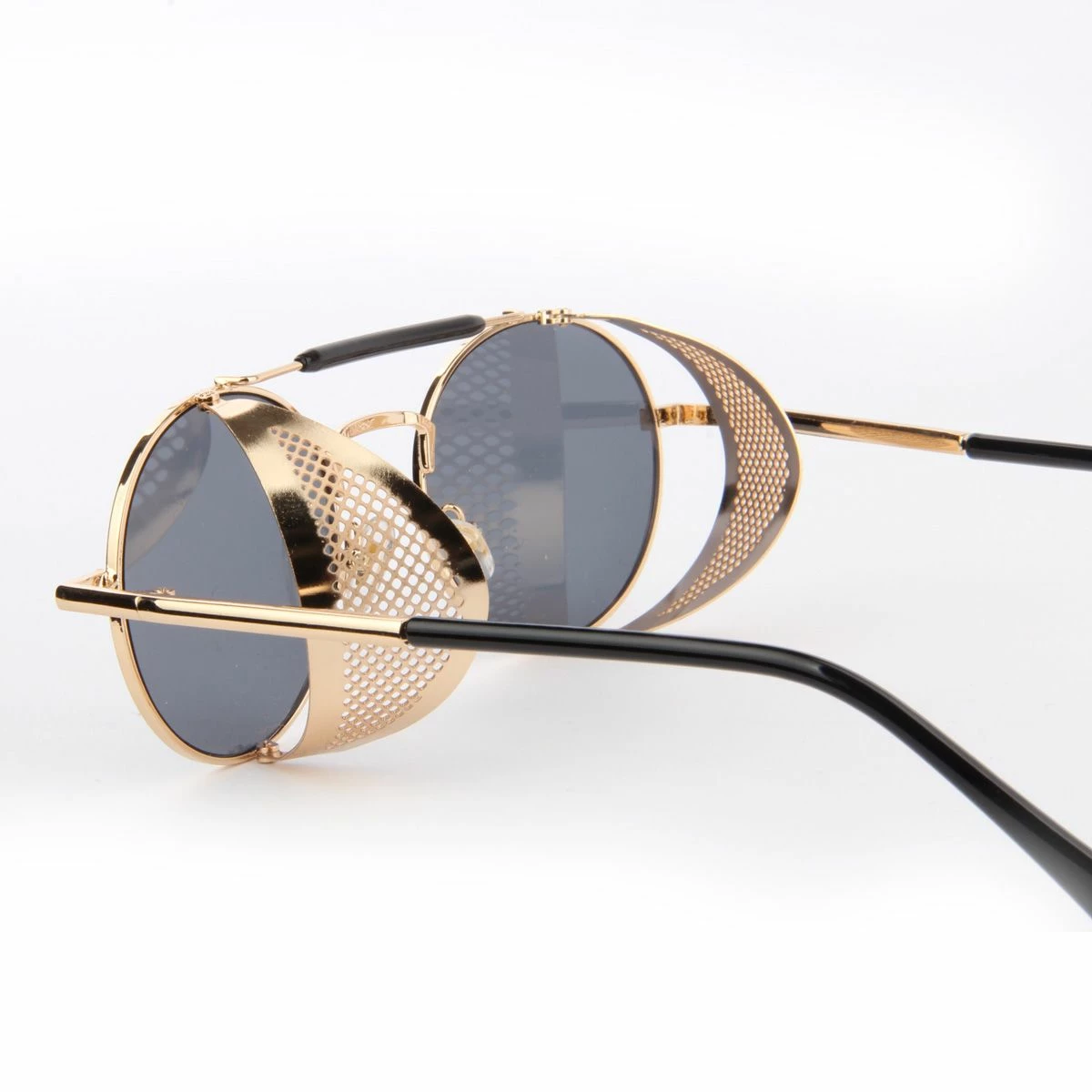 Goedkleurige, stoere heren zonnebril met verstelbare zijkleppen. Met deze bril maak je je foute party of steampunk outfit helemaal af.